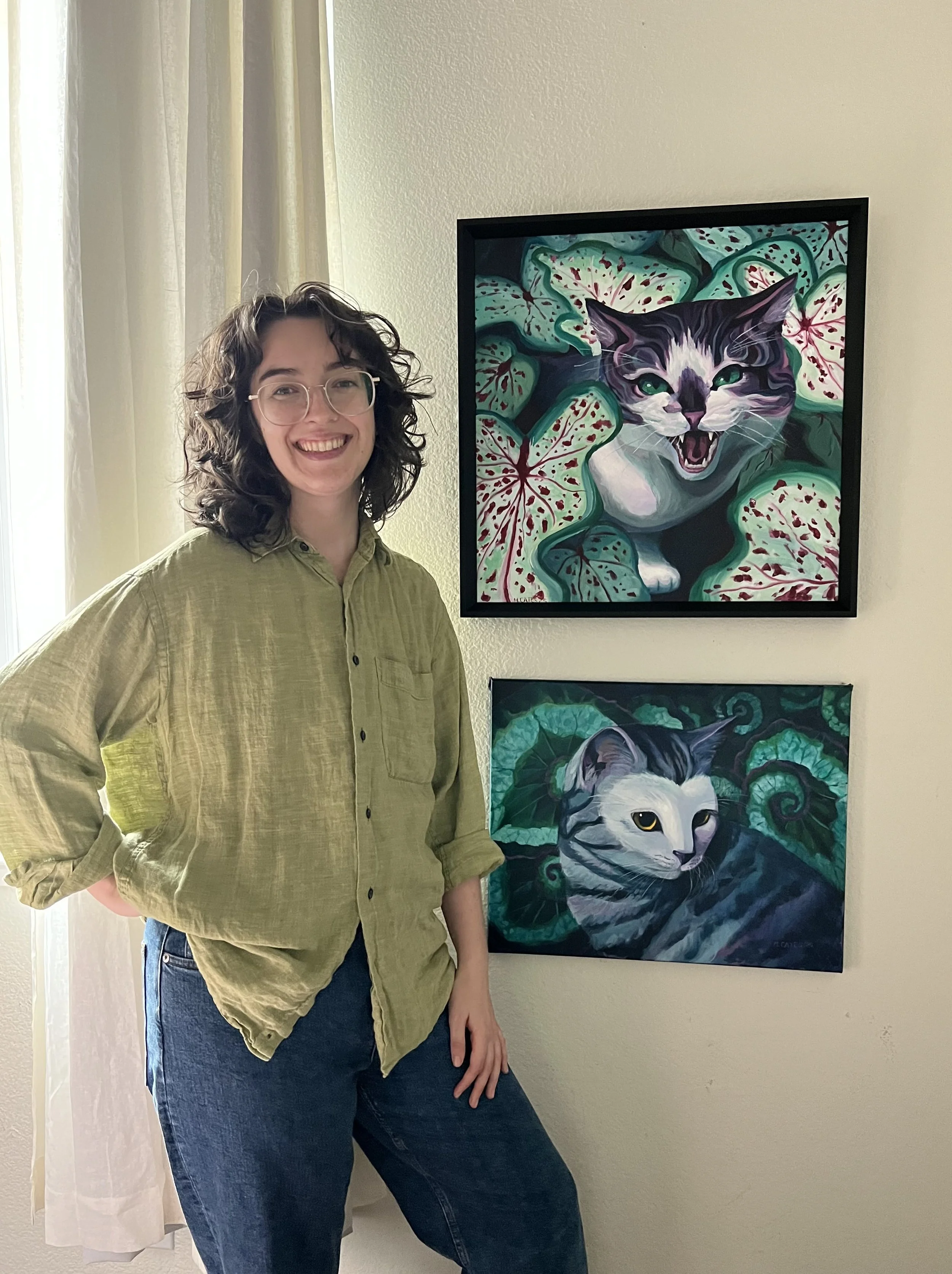For me, art is all about play and discovering the unexpected. My current series of acrylic paintings centers cats in the dreamlike space of our gardens. Suburban gardens are a meeting of realms where humans shape the wild by arranging plants and domesticating companion animals. Featuring lush botanicals and face-painted cats, I aim to float in the mystery of our pets’ inner worlds and the way we shape each other through our interactions in nature.